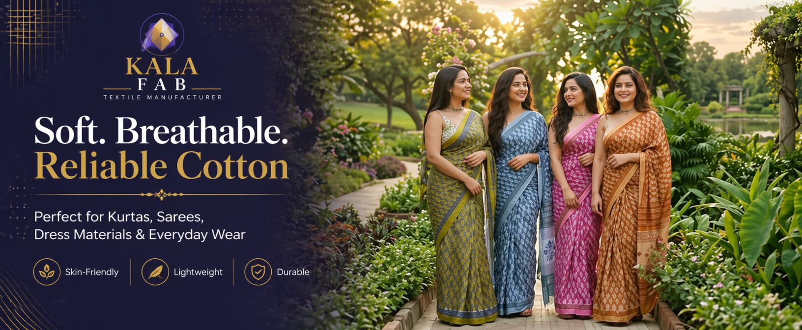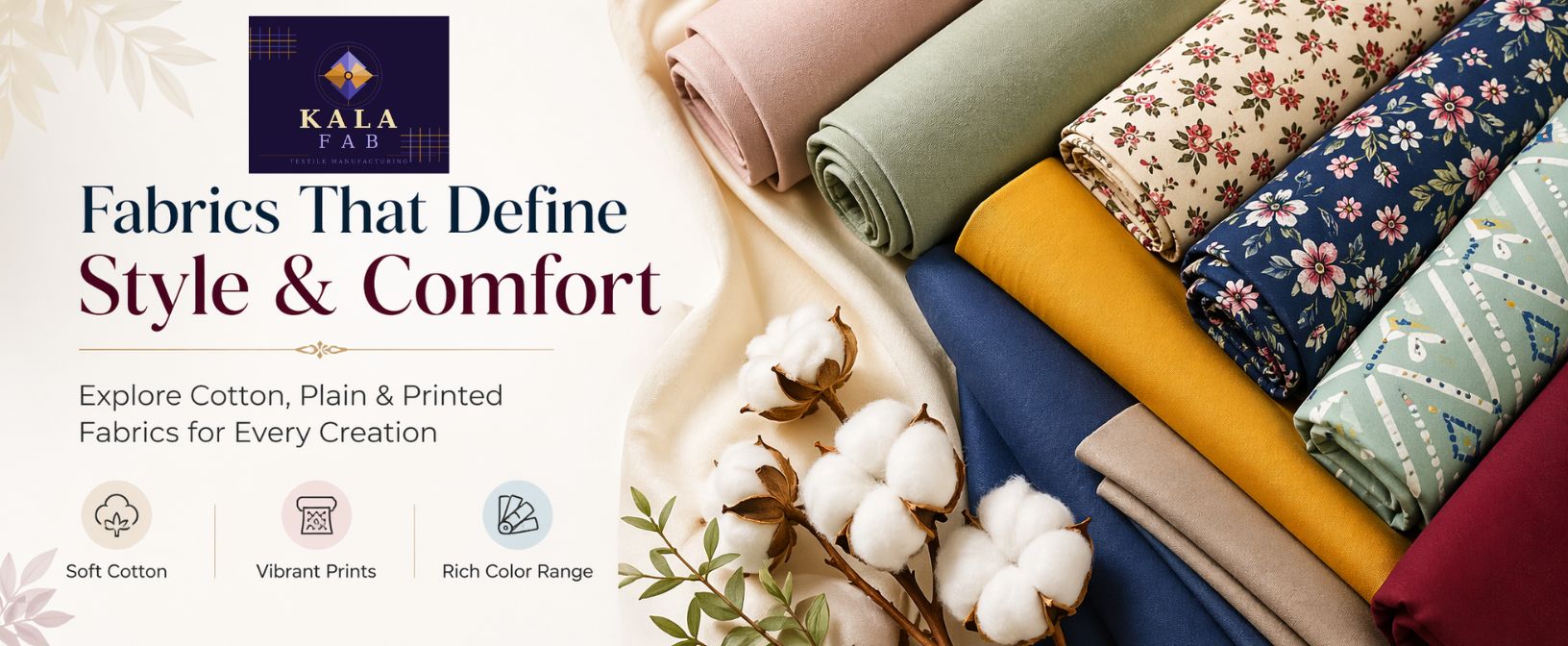 Kala Fab is a Surat-based manufacturer and wholesale supplier of cotton, plain, and printed fabrics, proudly operating from India's textile capital — Surat, Gujarat. With a strong foundation in fabric manufacturing, Kala Fab caters to garment makers, clothing brands, boutiques, and retailers across India who demand quality fabric at competitive factory-direct prices.